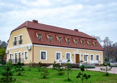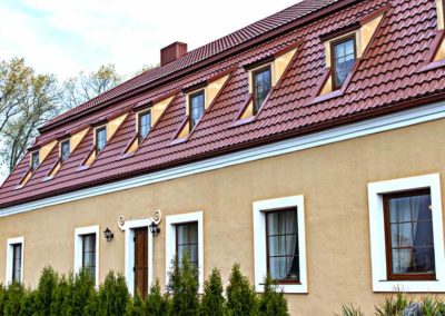 Modulinė plieno čerpė Malta yra stogo danga, kuri yra populiari ne tik gyvenamiesiems namams. Pateiktos atliktų darbų nuotraukos susijusios su svečių namais, įkurtais miesto pakraštyje. Savininkas sąmoningai pasirinko akį traukiančią raudoną stogo čerpių spalvą. Stogo danga puikiai kontrastuoja su aplink pastatą esančia žaluma.