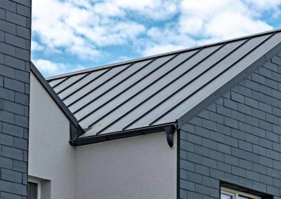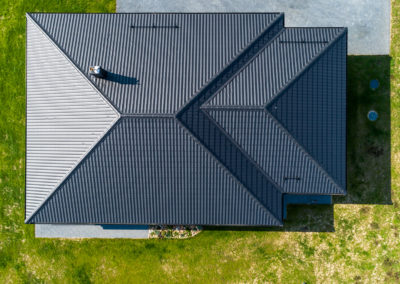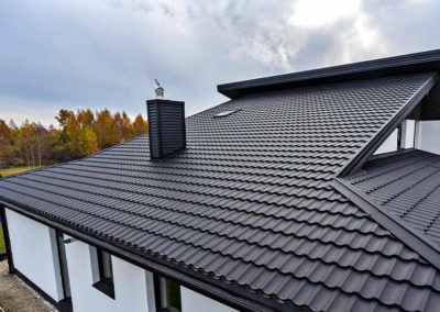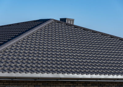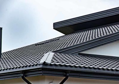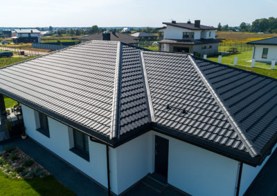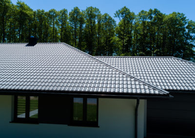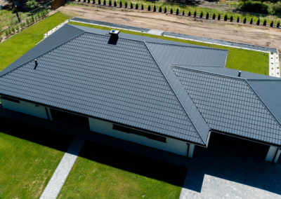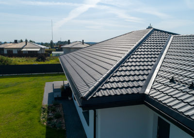Stilingas vienos šeimos namas, padengtas „Moderno“ modulinėmis metalinėmis stogo čerpėmis