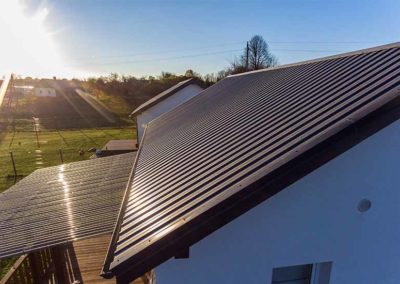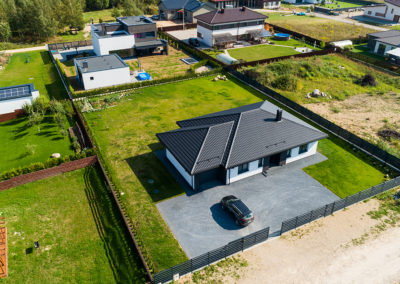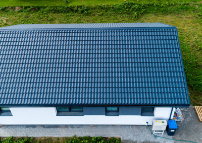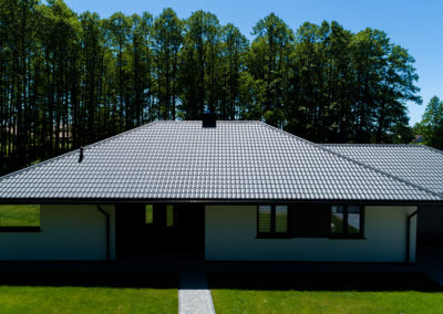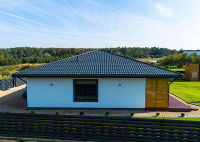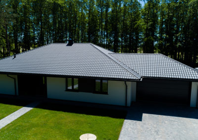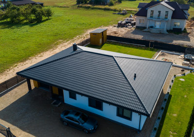 Vienbutis namas su šlaitiniu stogu, dengtas „Vena“ plieninėmis stogo čerpėmis.