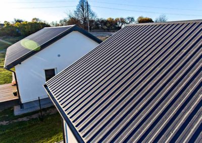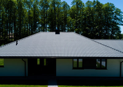 Įdomios architektūros, vieno aukšto namas padengtas „Moderno“ modulinėmis metalinėmis stogo čerpėmis. Tai suteikė pastataui nepakartojamą ir išskirtinę išvaizdą. Tamsi stogo dangos spalva kontrastuoja su šviesiu fasadu, suteikdama pastatui unikalų stilių. Modulinių stogo čerpių naudojimas leido sumažinti medžiagų nuostolius.