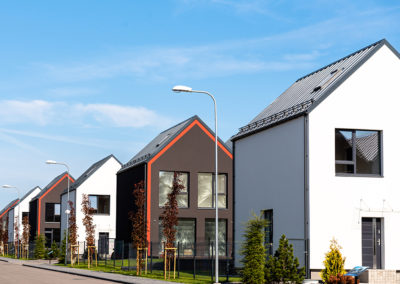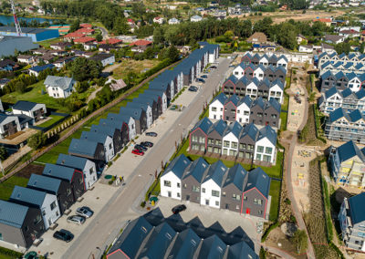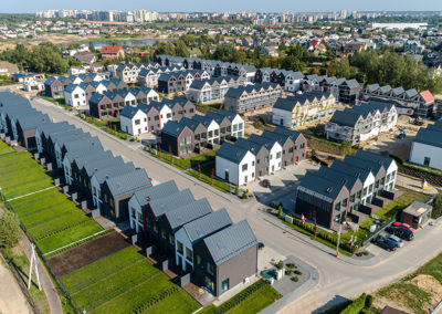 Gyvenamųjų namų rajonas, padengtas „Malta” ir „Argilla“ plieno čerpėmis.